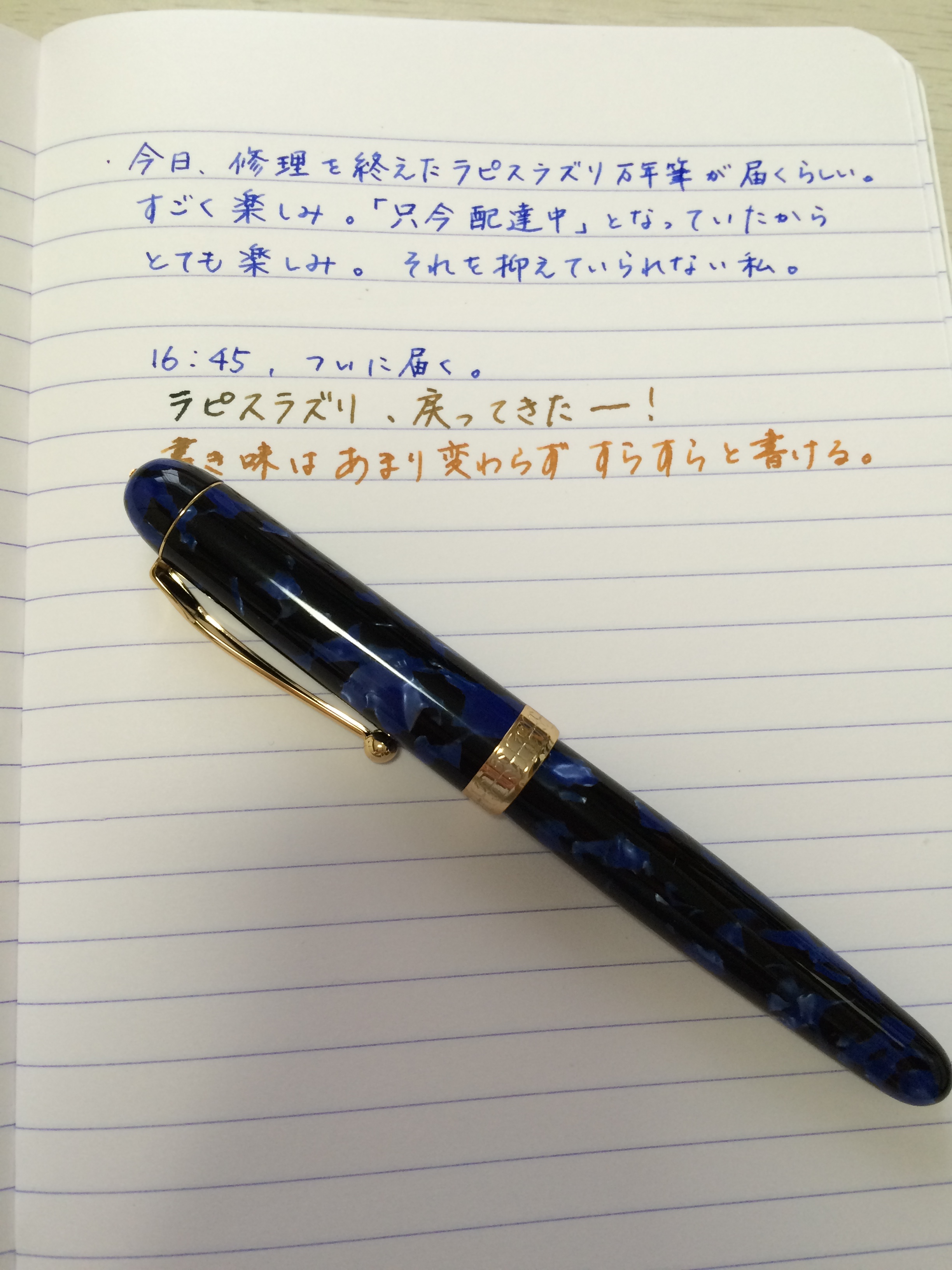 写真の万年筆、その名も「ラピスラズリ」というのですが、こちらが修理から戻ってきたことです。