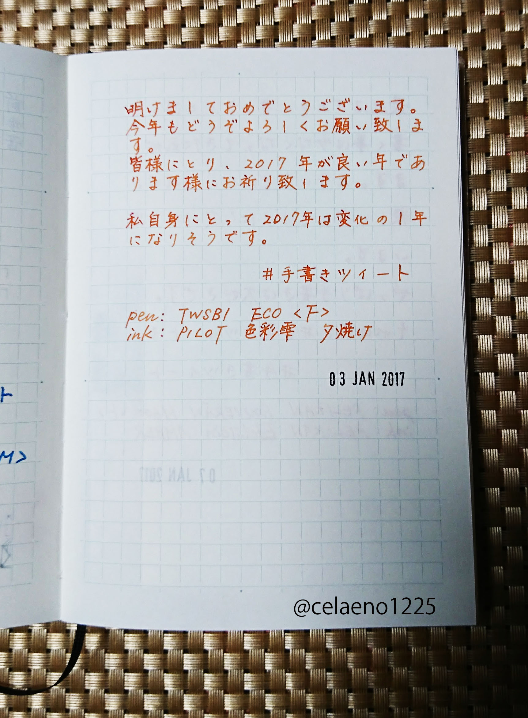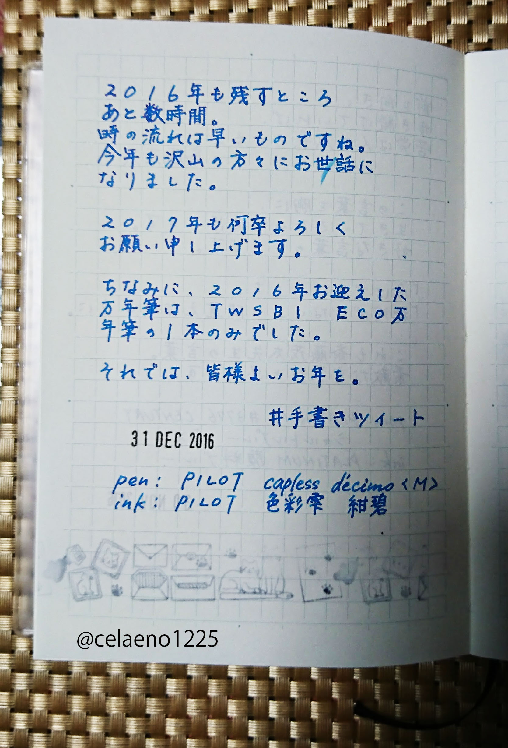 2016年12月の手書きツイートは実は1件だけです。 大晦日12月31日の手書きツイート。 2016年最後のご挨拶でした。実はこれ、間違いがありまして、2016年に購入した万年筆はTWSBI ECOとDELTA dolc …